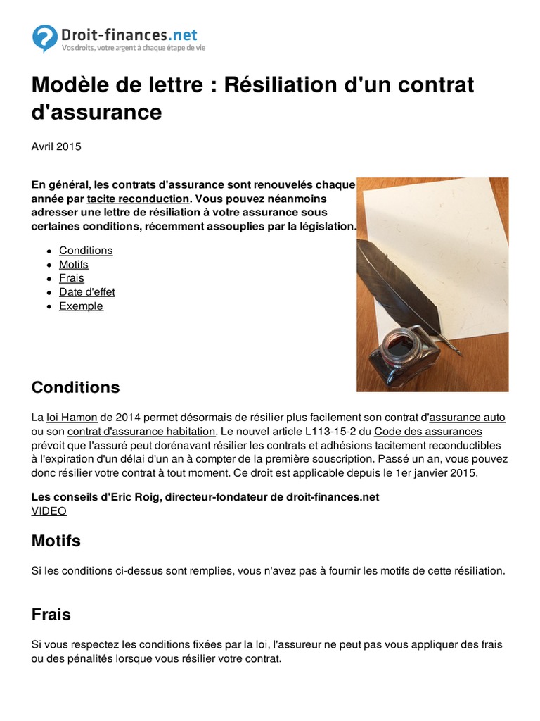 4 modèles de lettre pour résilier son contrat. Voici un exemple de lettre de résiliation assurance auto que vous pouvez utiliser dans vos démarches. La loi hamon de 2014 a profondément modifié les règles en la matière en posant le principe suivant : Madame, monsieur modèle de lettre de résiliation de votre contrat d'assurance. Seule différence, la résiliation doit intervenir avant le premier anniversaire.