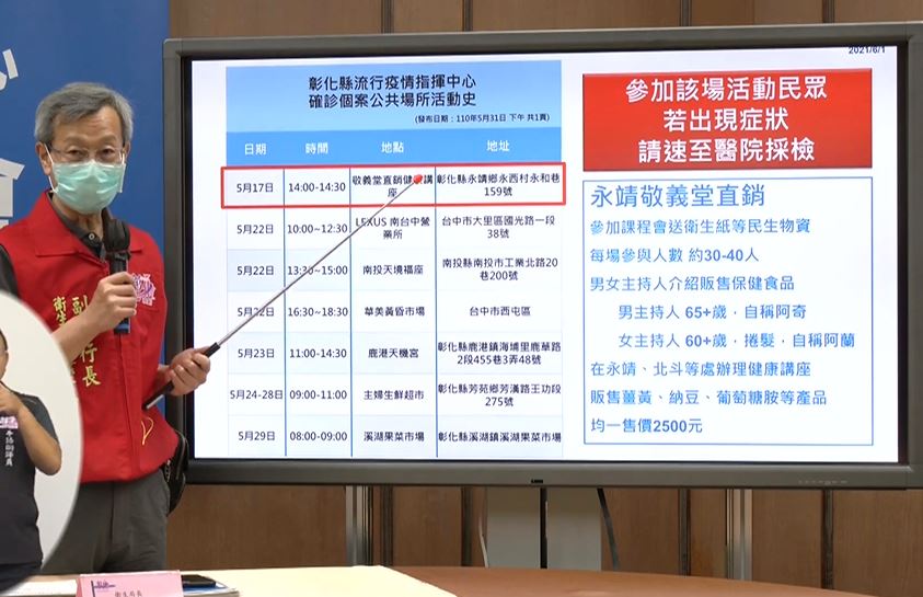 May 18, 2021 · 彰化新冠肺炎疫情緊繃,連續4天都有本土確診個案,衛生局截至今天為止已統計有42人確診,傍晚也公布最新足跡,不只是南. May 16, 2021 · 由於人數多,確診者足跡至少25處以上,衛生局公布確診個案公共場所活動史,彰化市下午茶美食小館、溪湖饕客燒烤火鍋、全聯田中新福店、埔心. May 20, 2021 · 「有確診者足跡」配合政策 內湖ikea宣布延長停業三天 內湖ikea被確認有新冠肺炎的確診者足跡,原本先宣布7月14日晚間閉店後進行徹底清消,7月15日. Jun 06, 2021 · 彰化新增確診活動史。 彰化縣6日再增3例,累計已211例,麻將傳播鏈回溯調查疑似是5月16日一位牌咖到彰化姐姐家拜訪,更與其他牌咖群聚、打牌,移動於不同的麻將所,在擴散到牌咖的家中、職場等,麻將傳播鏈已累計25人確診。 8月3日防疫記者會 連續第10天+0 防疫仍不能鬆懈 8/5(四)開始第五輪預約接種登記 提醒鄉親記得上網預約